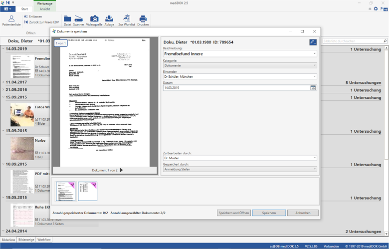 Im neuen Speichern-Fenster können Sie eingehende Dokumente nicht nur einem Patienten zuweisen, sondern auch direkt einem Arzt innerhalb Ihrer Praxis, der das Dokument dann in seinem „virtuellen Postkörbchen“ findet.